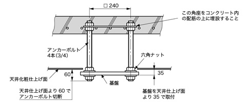 建築物に対する取付基礎用ボルトの設置工事に際し、無影灯器具の重量がかかりますので脱落及び、安全率に十分配慮し、工事して下さい。